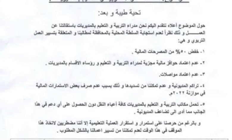 مديرو التربية والتعليم بمديريات محافظة المهرة يتقدمون برسالة استقالة من العمل